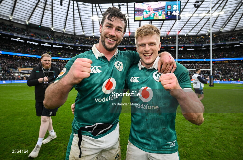 21 February 2026; Ireland players Caelan Doris, left, and Tommy O'Brien after their side's victory in the Guinness 6 Nations Rugby Championship match between England and Ireland at the Allianz Stadium in Twickenham, England. Photo by Brendan Moran/Sportsfile