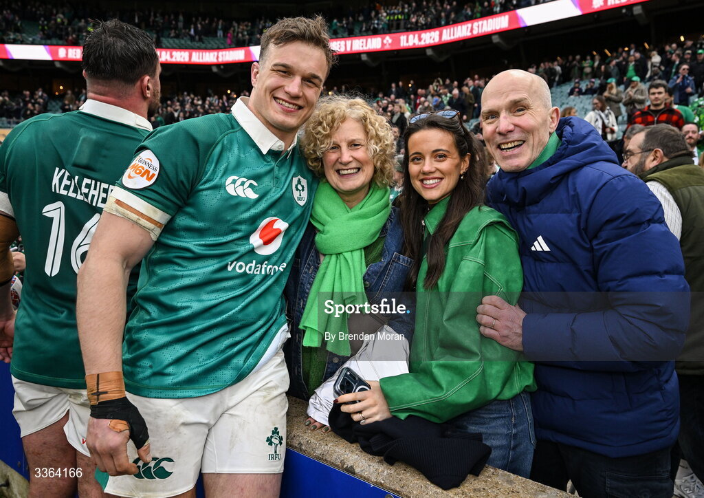 21 February 2026; Josh van der Flier of Ireland with family members, from left, mother Olly, wife Sophie De Patoul, and father Dirk, after the Guinness 6 Nations Rugby Championship match between England and Ireland at the Allianz Stadium in Twickenham, England. Photo by Brendan Moran/Sportsfile