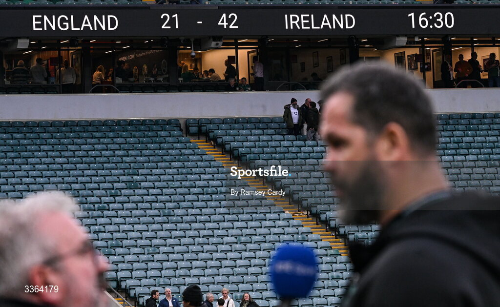 21 February 2026; Ireland head coach Andy Farrell is interviewed after the Guinness 6 Nations Rugby Championship match between England and Ireland at the Allianz Stadium in Twickenham, England. Photo by Ramsey Cardy/Sportsfile