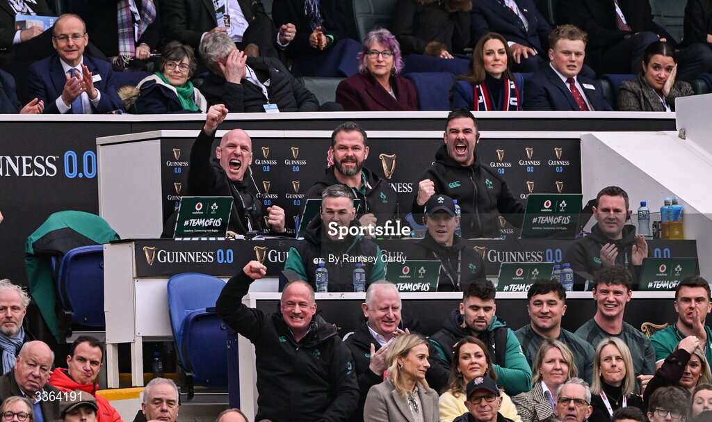 21 February 2026; Members of the Ireland backroom staff, including, from left, forwards coach Paul O'Connell, IRFU performance director David Humphreys, assistant coach Jonathan Sexton, head coach Andy Farrell, assistant coach Simon Easterby, high performance analyst Vinny Hammond and performance analyst John Buckley, during the Guinness 6 Nations Rugby Championship match between England and Ireland at the Allianz Stadium in Twickenham, England. Photo by Ramsey Cardy/Sportsfile