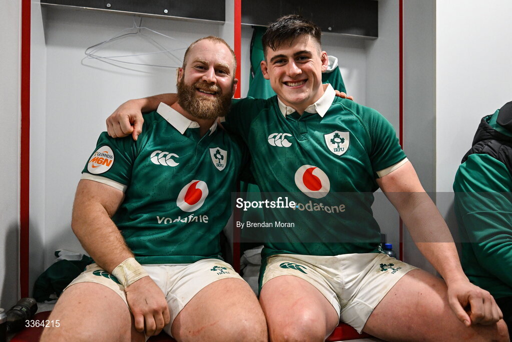 21 February 2026; Ireland players Jeremy Loughman, left, and Dan Sheehan in the dressing room after the Guinness 6 Nations Rugby Championship match between England and Ireland at the Allianz Stadium in Twickenham, England. Photo by Brendan Moran/Sportsfile