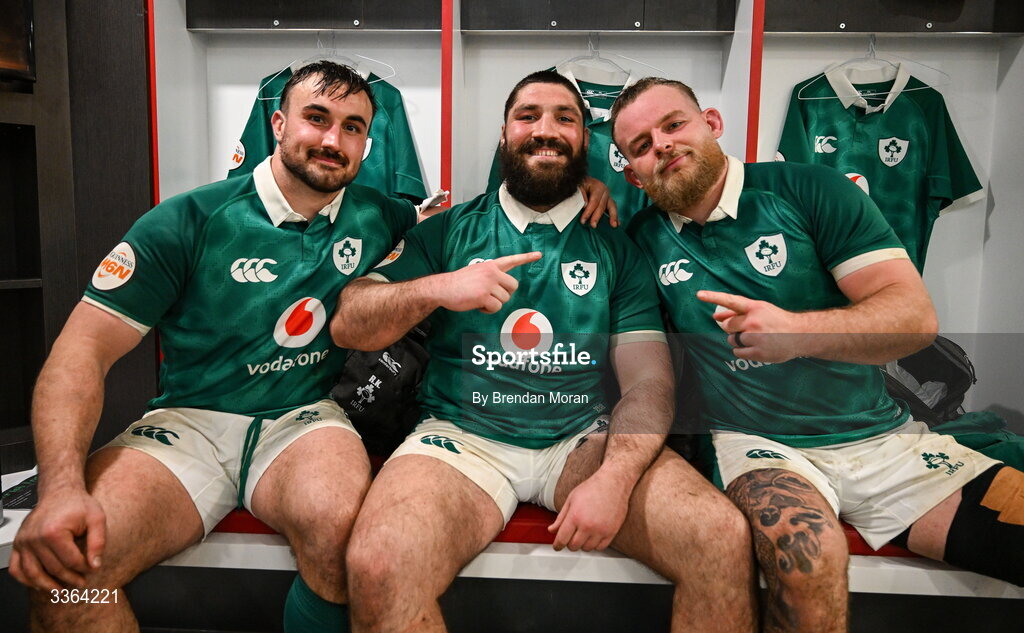21 February 2026; Ireland players, from left, Rónan Kelleher, Tom O’Toole, and Finlay Bealham, in the dressing room after the Guinness 6 Nations Rugby Championship match between England and Ireland at the Allianz Stadium in Twickenham, England. Photo by Brendan Moran/Sportsfile