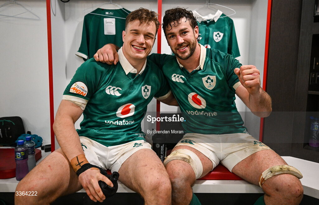21 February 2026; Ireland players Josh van der Flier, left, and Caelan Doris in the dressing room after the Guinness 6 Nations Rugby Championship match between England and Ireland at the Allianz Stadium in Twickenham, England. Photo by Brendan Moran/Sportsfile