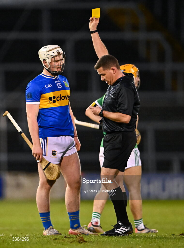 21 February 2026; Darragh McCarthy of Tipperary is shown the yellow card by referee Colm Lyons during the Allianz Hurling League Division 1A match between Tipperary and Limerick at FBD Semple Stadium in Thurles, Tipperary. Photo by Piaras Ó Mídheach/Sportsfile