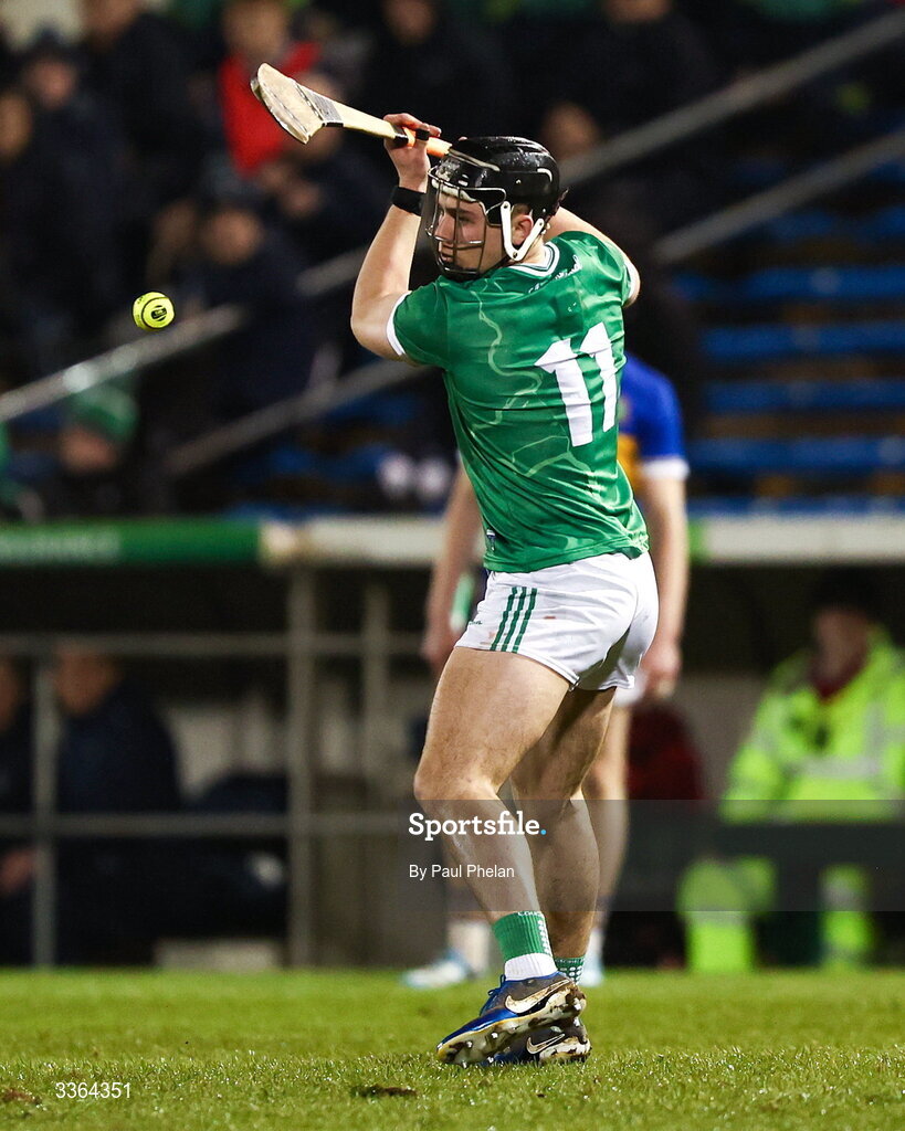 21 February 2026; Aidan O'Connor of Limerick scores a free during the Allianz Hurling League Division 1A match between Tipperary and Limerick at FBD Semple Stadium in Thurles, Tipperary. Photo by Paul Phelan/Sportsfile