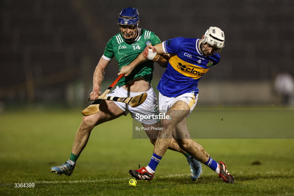 21 February 2026; Shane O'Brien of Limerick in action against Craig Morgan of Tipperary during the Allianz Hurling League Division 1A match between Tipperary and Limerick at FBD Semple Stadium in Thurles, Tipperary. Photo by Paul Phelan/Sportsfile