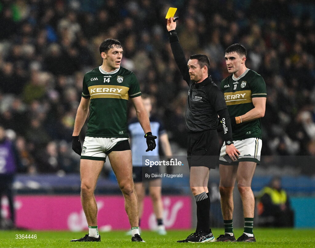 21 February 2026; Referee Patrick Neilan shows a yellow card to David Clifford of Kerry during the Allianz Football League Division 1 match between Dublin and Kerry at Croke Park in Dublin. Photo by David Fitzgerald/Sportsfile