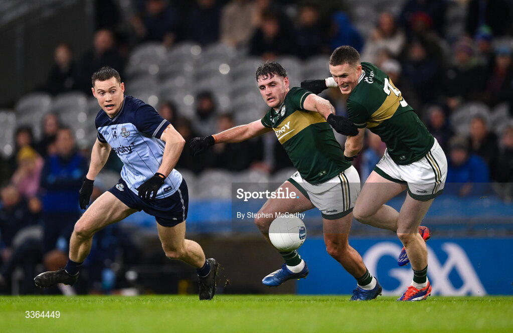 21 February 2026; Con O'Callaghan of Dublin in action against Graham O'Sullivan and Jason Foley, right, of Kerry during the Allianz Football League Division 1 match between Dublin and Kerry at Croke Park in Dublin. Photo by Stephen McCarthy/Sportsfile