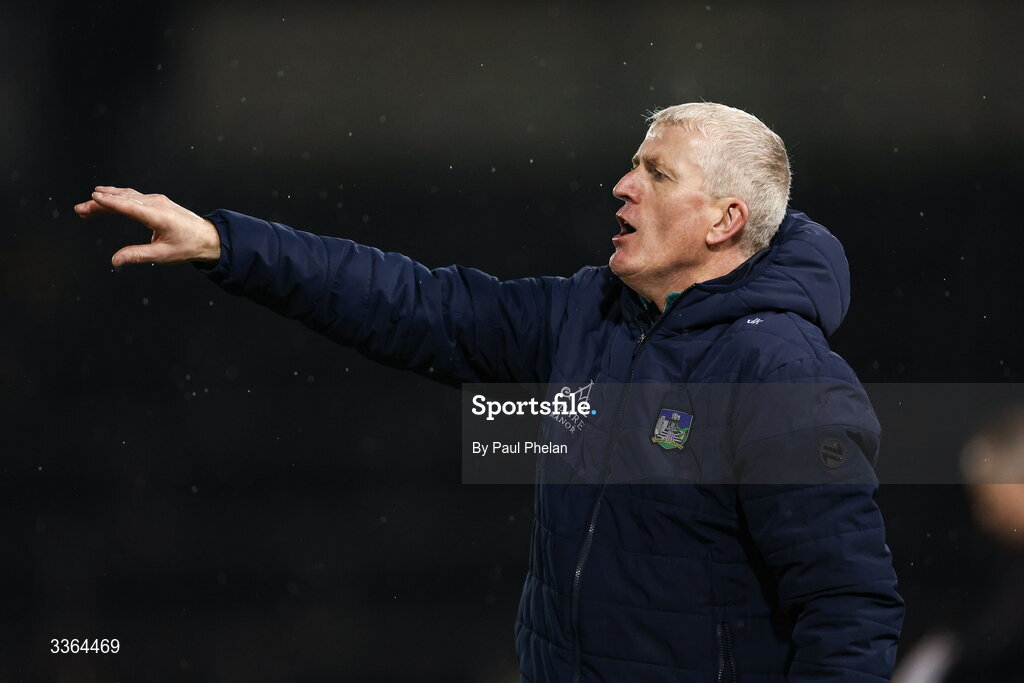 21 February 2026; Limerick manager John Kiely motivates his team during the Allianz Hurling League Division 1A match between Tipperary and Limerick at FBD Semple Stadium in Thurles, Tipperary. Photo by Paul Phelan/Sportsfile
