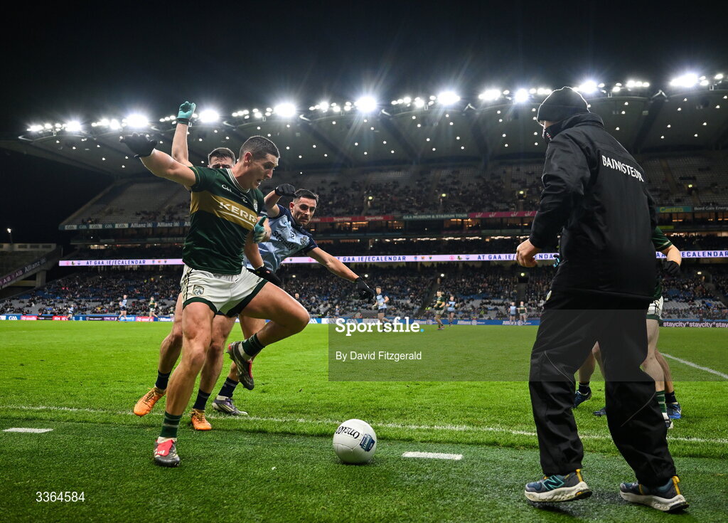 21 February 2026; Joe O’Connor of Kerry in action against Brian Howard and Niall Scully of Dublin during the Allianz Football League Division 1 match between Dublin and Kerry at Croke Park in Dublin. Photo by David Fitzgerald/Sportsfile