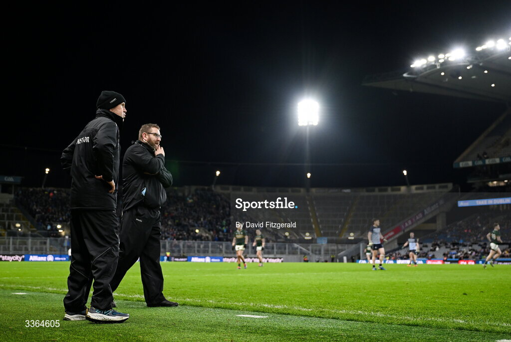 21 February 2026; Kerry manager Jack O’Connor, left, and selector Cian O'Neill during the Allianz Football League Division 1 match between Dublin and Kerry at Croke Park in Dublin. Photo by David Fitzgerald/Sportsfile
