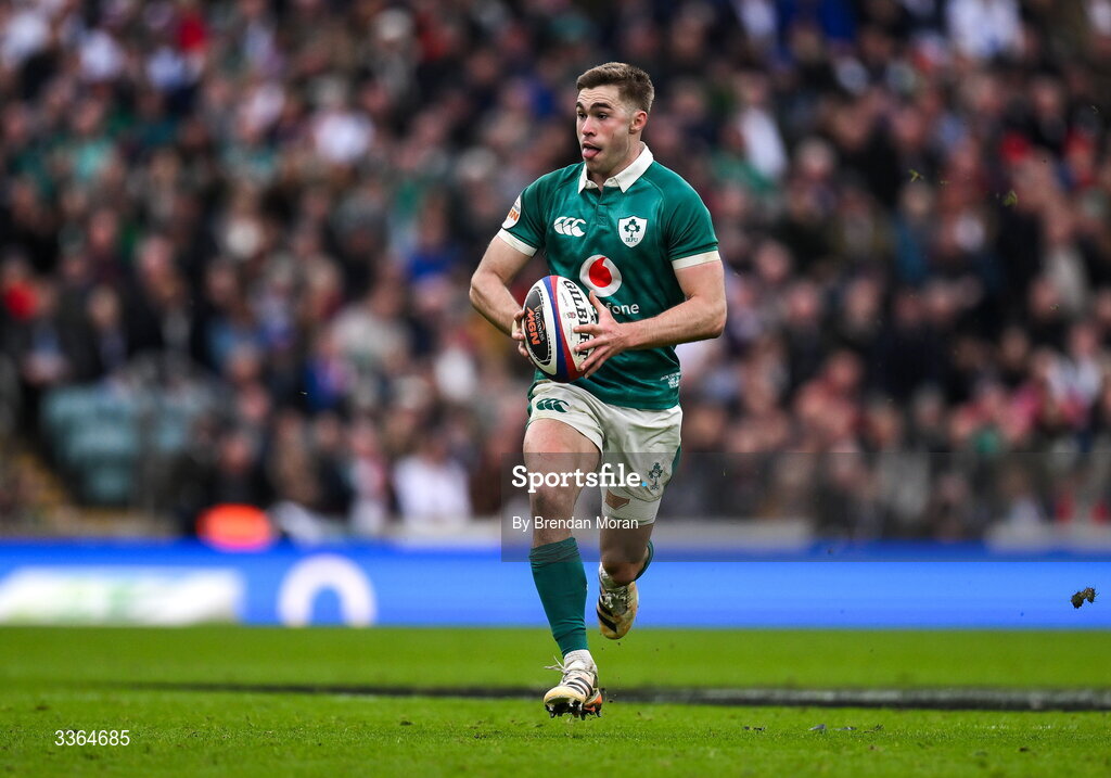 21 February 2026; Jack Crowley of Ireland during the Guinness 6 Nations Rugby Championship match between England and Ireland at the Allianz Stadium in Twickenham, England. Photo by Brendan Moran/Sportsfile