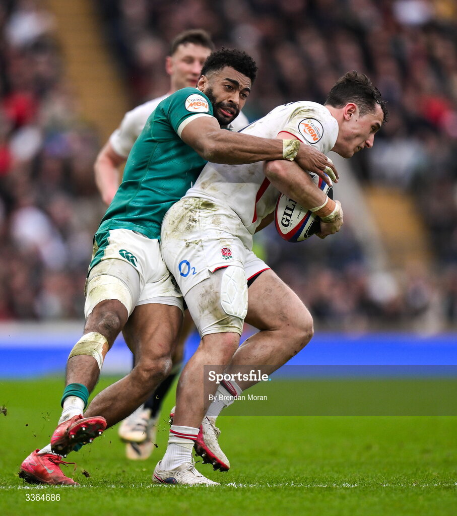 21 February 2026; Robert Baloucoune of Ireland tackles Henry Arundell of England during the Guinness 6 Nations Rugby Championship match between England and Ireland at the Allianz Stadium in Twickenham, England. Photo by Brendan Moran/Sportsfile