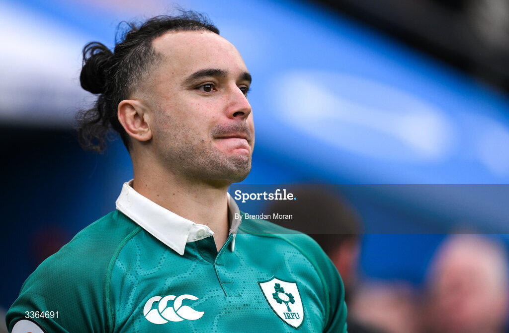 21 February 2026; James Lowe of Ireland watches the final moments of the Guinness 6 Nations Rugby Championship match between England and Ireland at the Allianz Stadium in Twickenham, England. Photo by Brendan Moran/Sportsfile