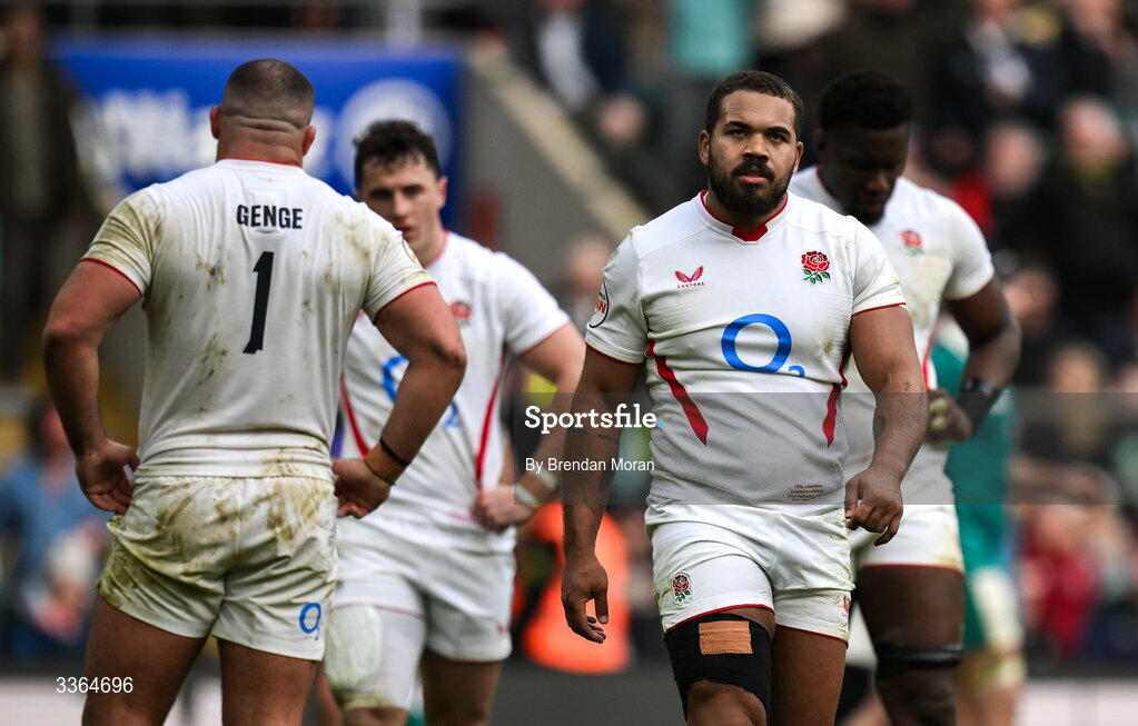 21 February 2026; Ollie Lawrence of England reacts after his side conceded a try during the Guinness 6 Nations Rugby Championship match between England and Ireland at the Allianz Stadium in Twickenham, England. Photo by Brendan Moran/Sportsfile