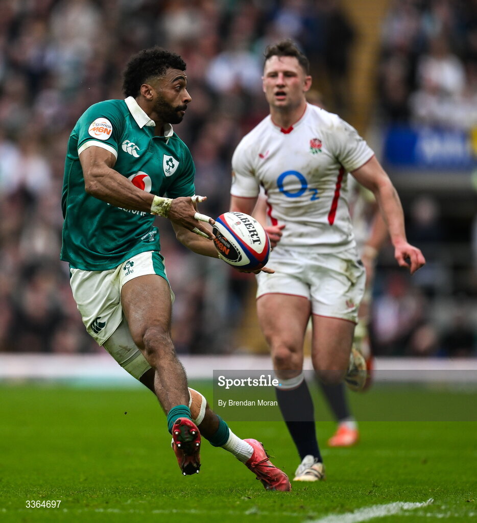 21 February 2026; Robert Baloucoune of Ireland during the Guinness 6 Nations Rugby Championship match between England and Ireland at the Allianz Stadium in Twickenham, England. Photo by Brendan Moran/Sportsfile