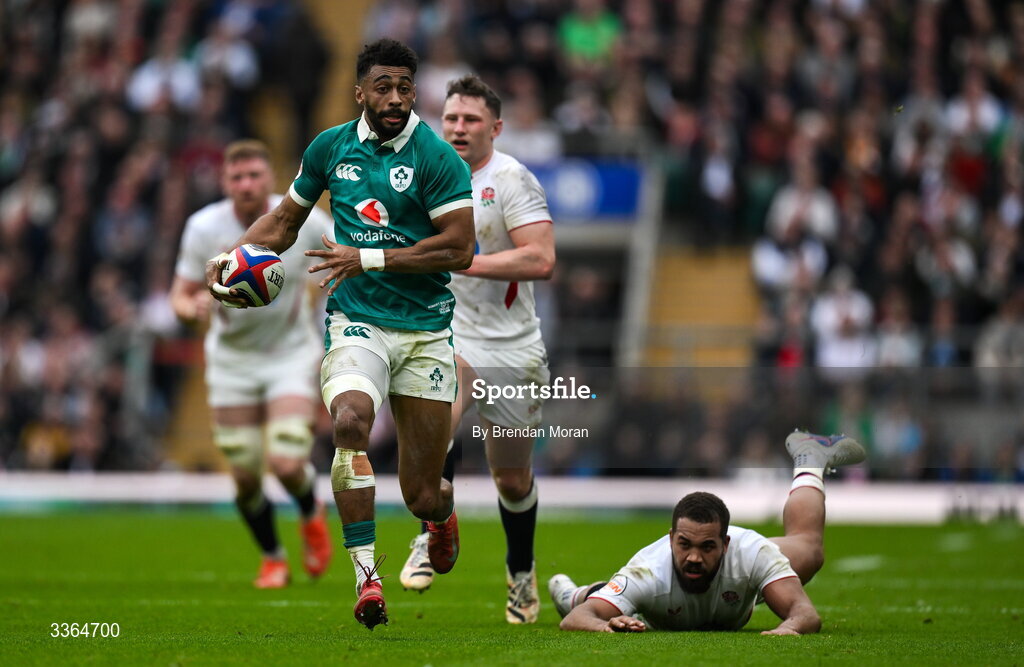 21 February 2026; Robert Baloucoune of Ireland breaks clear of Ollie Lawrence of England during the Guinness 6 Nations Rugby Championship match between England and Ireland at the Allianz Stadium in Twickenham, England. Photo by Brendan Moran/Sportsfile