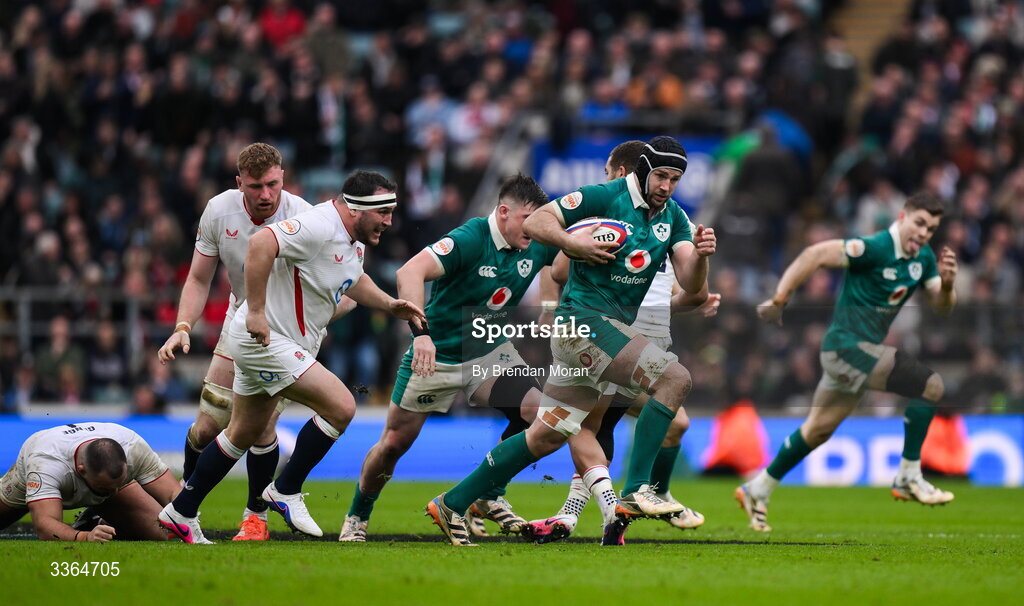 21 February 2026; Caelan Doris of Ireland makes a break during the Guinness 6 Nations Rugby Championship match between England and Ireland at the Allianz Stadium in Twickenham, England. Photo by Brendan Moran/Sportsfile