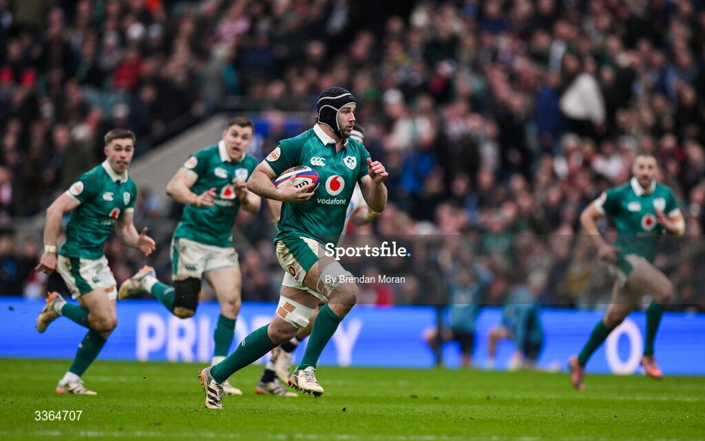 21 February 2026; Caelan Doris of Ireland makes a break during the Guinness 6 Nations Rugby Championship match between England and Ireland at the Allianz Stadium in Twickenham, England. Photo by Brendan Moran/Sportsfile