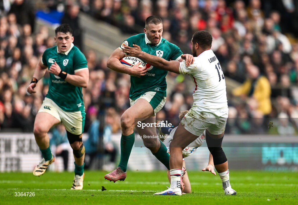 21 February 2026; Stuart McCloskey of Ireland is tackled by Ollie Lawrence of England during the Guinness 6 Nations Rugby Championship match between England and Ireland at the Allianz Stadium in Twickenham, England. Photo by Brendan Moran/Sportsfile
