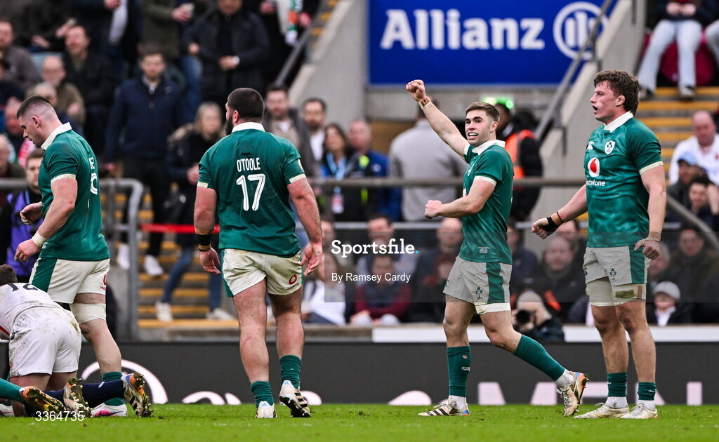 21 February 2026; Jack Crowley of Ireland celebrates at the final whistle of the Guinness 6 Nations Rugby Championship match between England and Ireland at the Allianz Stadium in Twickenham, England. Photo by Ramsey Cardy/Sportsfile