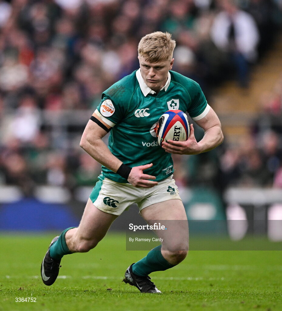 21 February 2026; Tommy O'Brien of Ireland during the Guinness 6 Nations Rugby Championship match between England and Ireland at the Allianz Stadium in Twickenham, England. Photo by Ramsey Cardy/Sportsfile