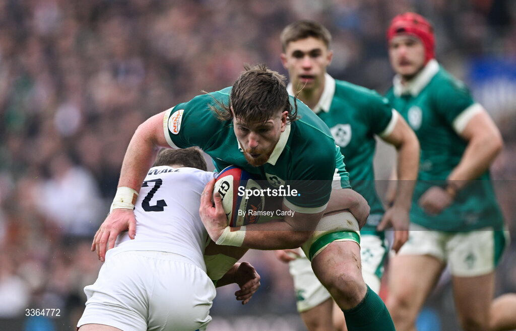 21 February 2026; Joe McCarthy of Ireland is tackled by Luke Cowan-Dickie of England during the Guinness 6 Nations Rugby Championship match between England and Ireland at the Allianz Stadium in Twickenham, England. Photo by Ramsey Cardy/Sportsfile