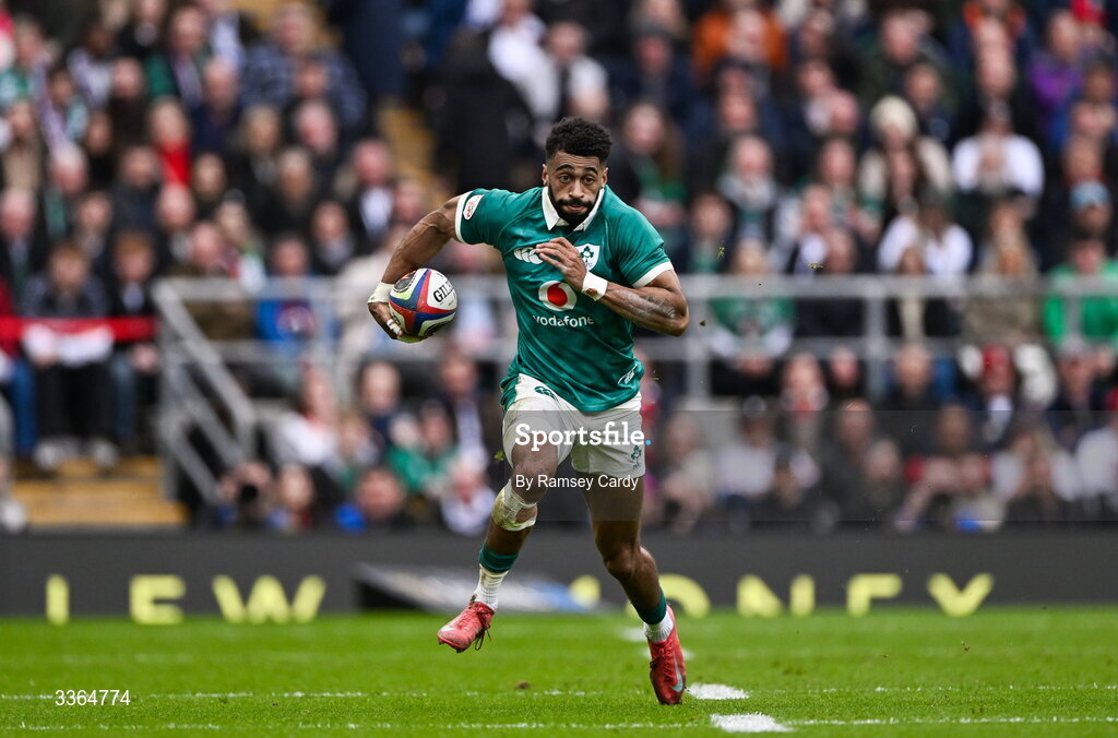 21 February 2026; Robert Baloucoune of Ireland during the Guinness 6 Nations Rugby Championship match between England and Ireland at the Allianz Stadium in Twickenham, England. Photo by Ramsey Cardy/Sportsfile