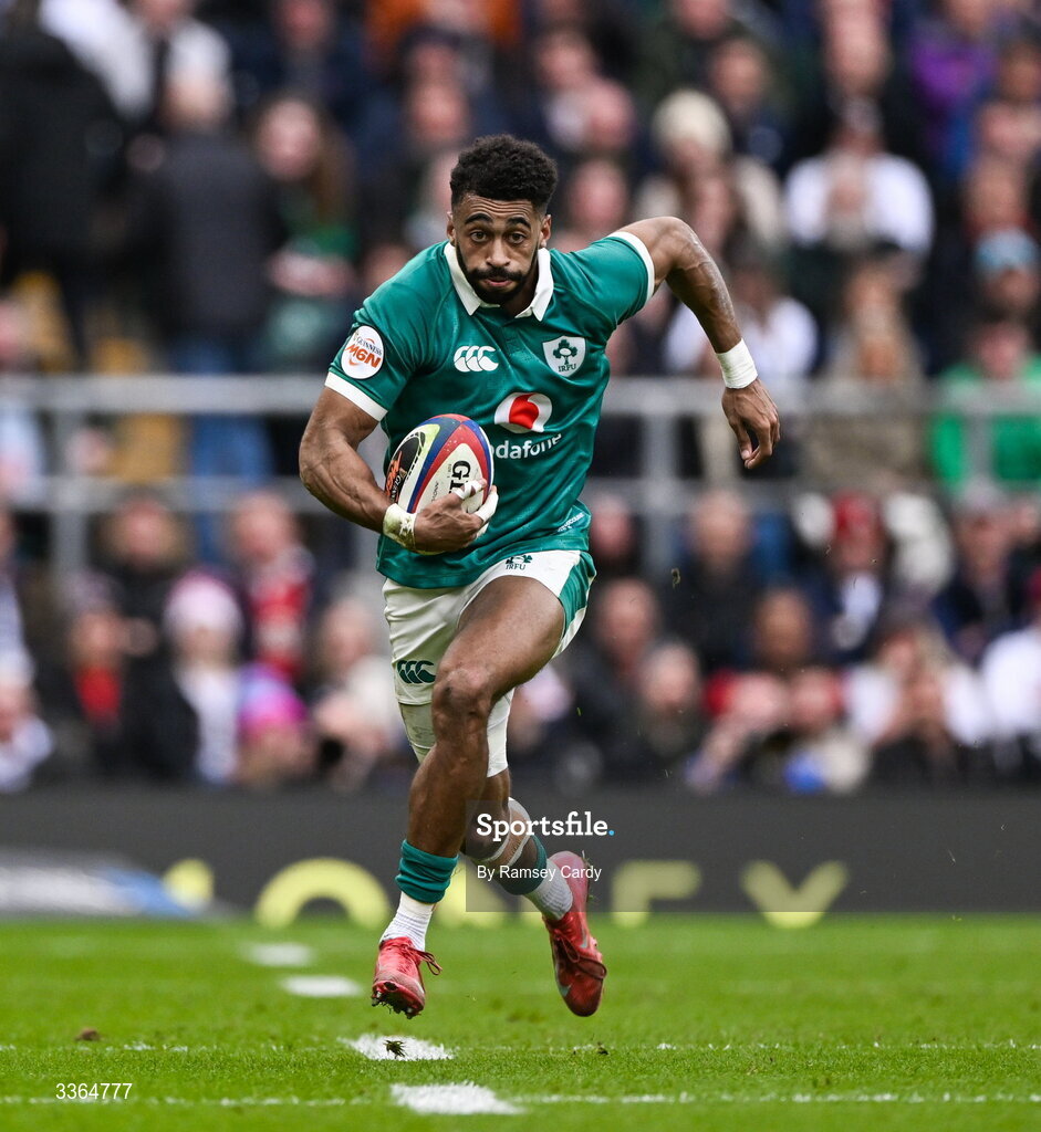 21 February 2026; Robert Baloucoune of Ireland during the Guinness 6 Nations Rugby Championship match between England and Ireland at the Allianz Stadium in Twickenham, England. Photo by Ramsey Cardy/Sportsfile