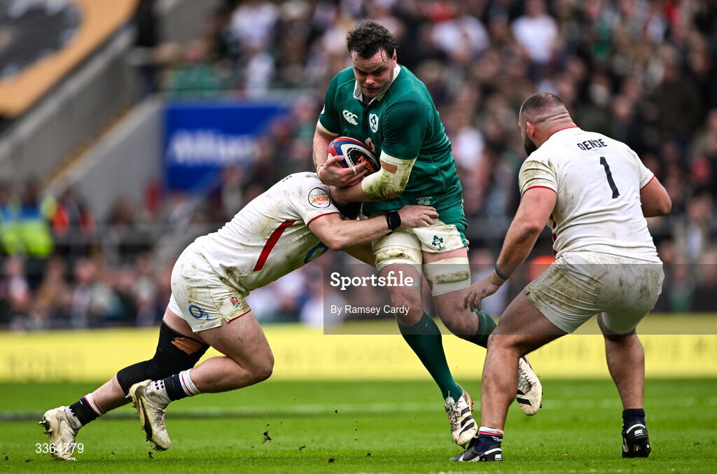 21 February 2026; James Ryan of Ireland is tackled by Luke Cowan-Dickie of England during the Guinness 6 Nations Rugby Championship match between England and Ireland at the Allianz Stadium in Twickenham, England. Photo by Ramsey Cardy/Sportsfile