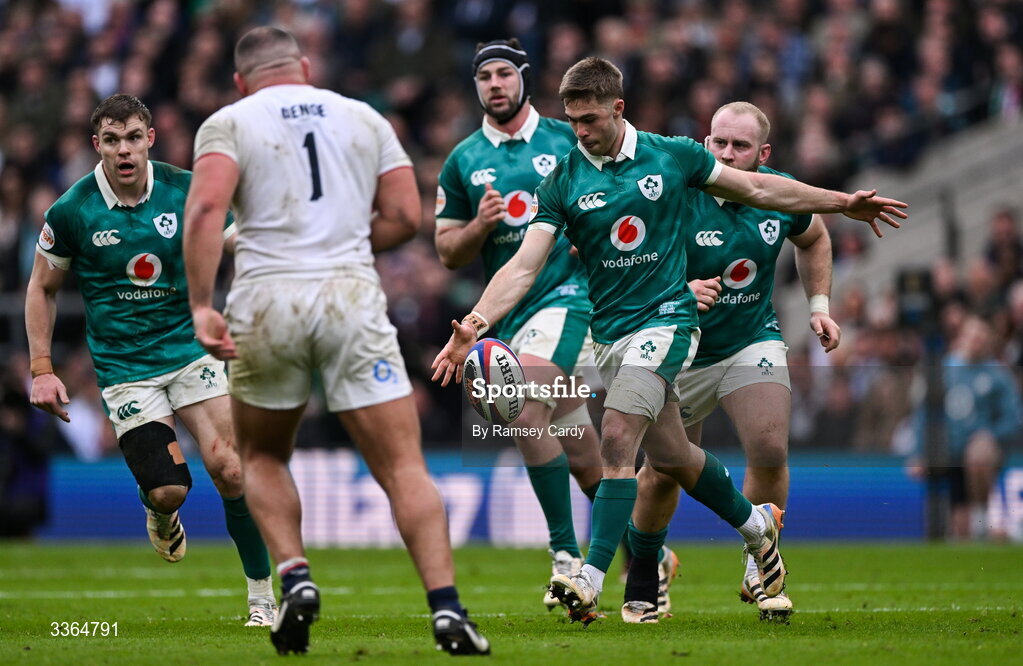 21 February 2026; Jack Crowley of Ireland during the Guinness 6 Nations Rugby Championship match between England and Ireland at the Allianz Stadium in Twickenham, England. Photo by Ramsey Cardy/Sportsfile