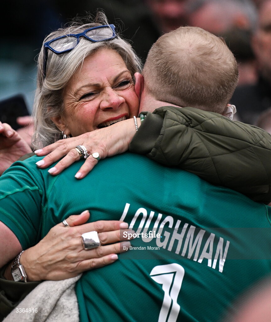 21 February 2026; Jeremy Loughman of Ireland celebrates with his mother Katja after the Guinness 6 Nations Rugby Championship match between England and Ireland at the Allianz Stadium in Twickenham, England. Photo by Brendan Moran/Sportsfile