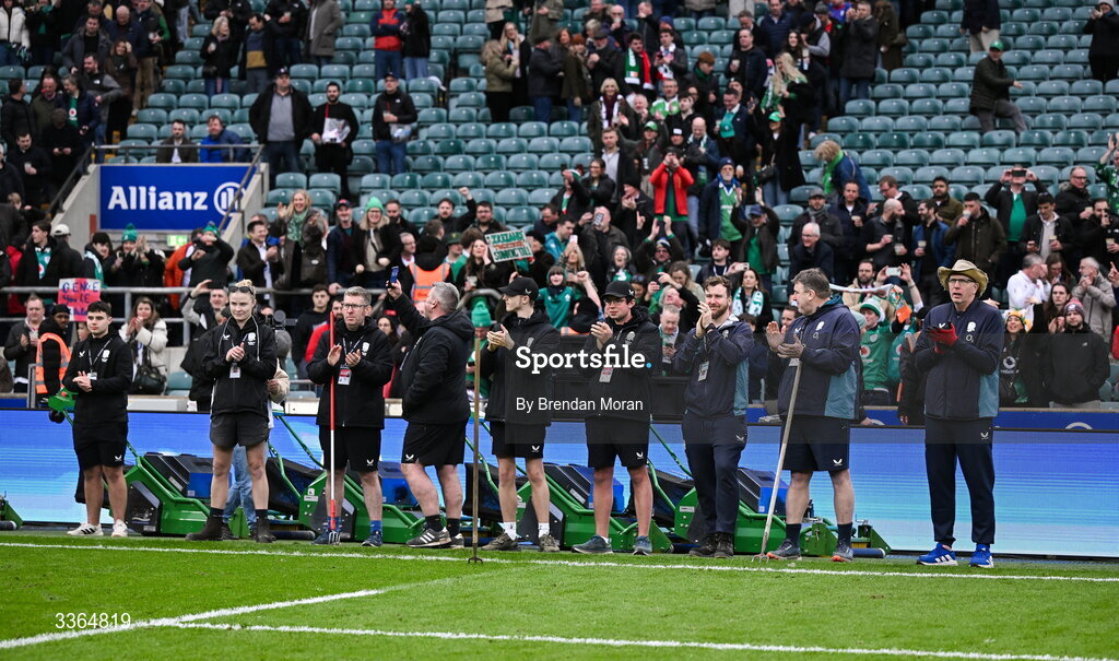 21 February 2026; The Twickenham Stadium groundstaff applaud the Irish team during their lap of honour after the Guinness 6 Nations Rugby Championship match between England and Ireland at the Allianz Stadium in Twickenham, England. Photo by Brendan Moran/Sportsfile