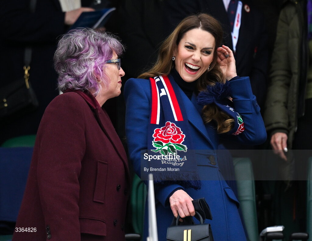 21 February 2026; Catherine, Princess Of Wales and Patron of the RFU, with chairperson of the RFU Deborah Griffin, left, before the Guinness 6 Nations Rugby Championship match between England and Ireland at the Allianz Stadium in Twickenham, England. Photo by Brendan Moran/Sportsfile