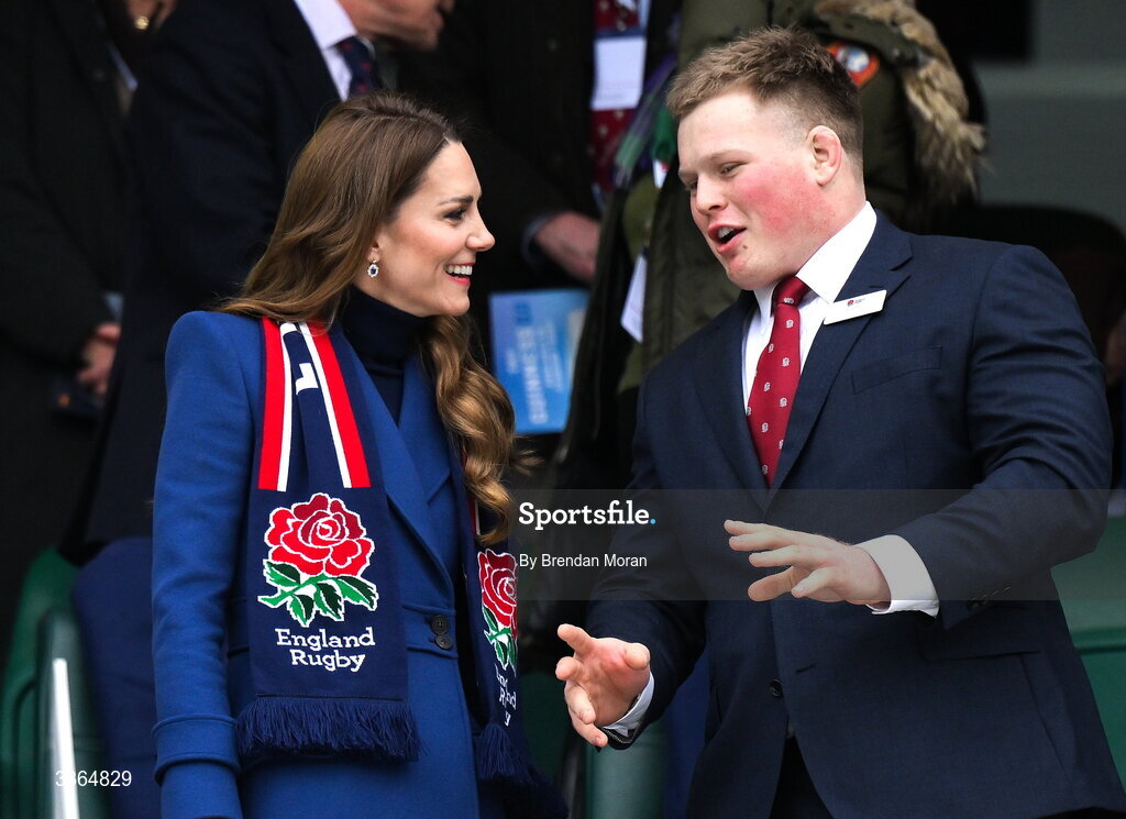 21 February 2026; Catherine, Princess Of Wales and Patron of the RFU, with Fin Baster of England before the Guinness 6 Nations Rugby Championship match between England and Ireland at the Allianz Stadium in Twickenham, England. Photo by Brendan Moran/Sportsfile