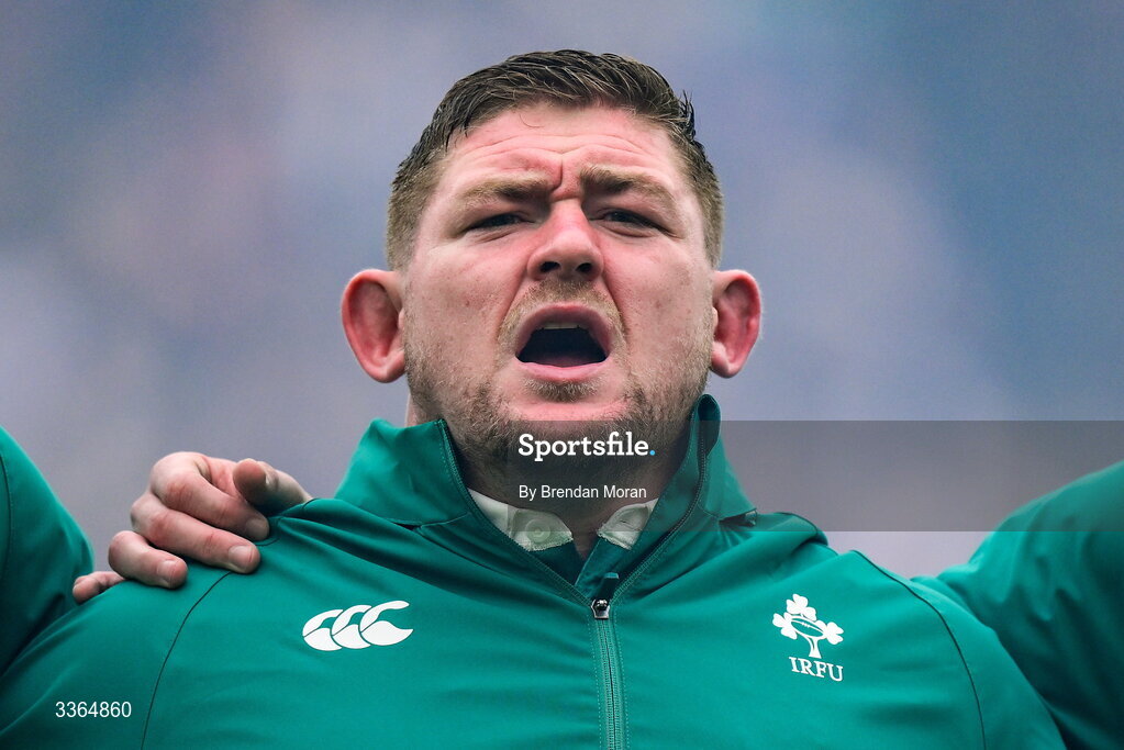 21 February 2026; Tadhg Furlong of Ireland during the national anthems before the Guinness 6 Nations Rugby Championship match between England and Ireland at the Allianz Stadium in Twickenham, England. Photo by Brendan Moran/Sportsfile