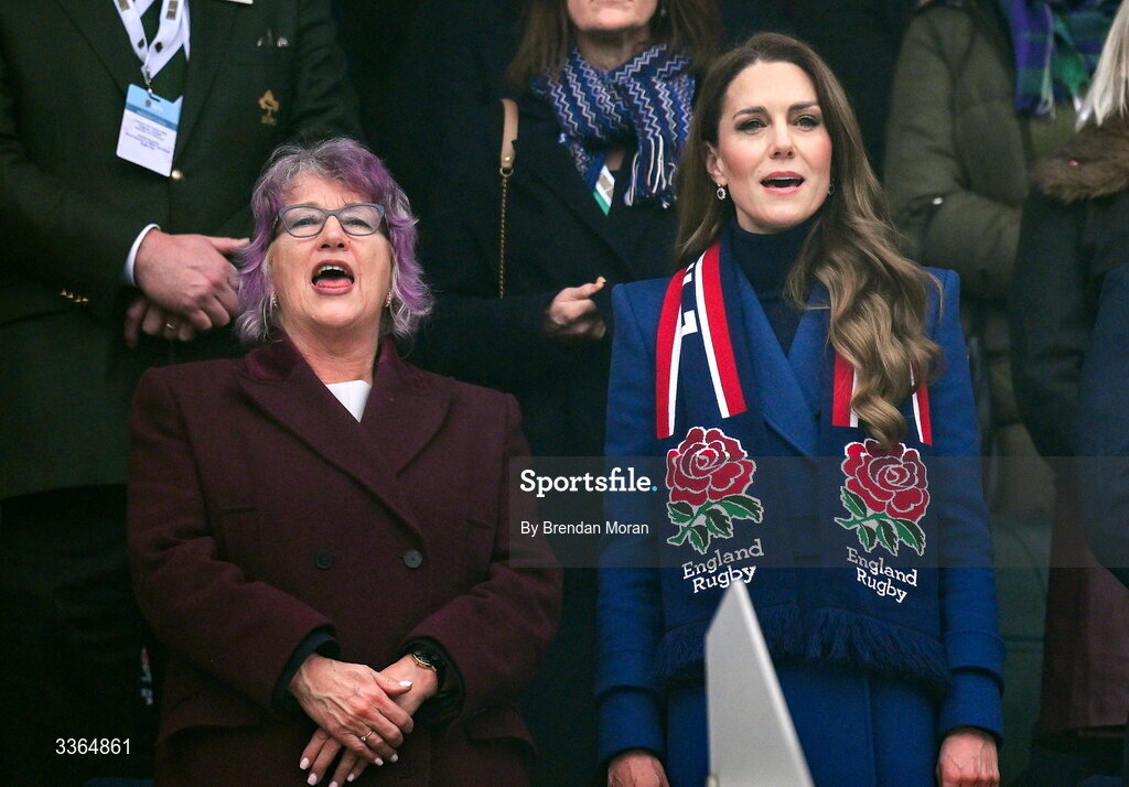 21 February 2026; Catherine, Princess Of Wales and Patron of the RFU, with chairperson of the RFU Deborah Griffin, left, before the Guinness 6 Nations Rugby Championship match between England and Ireland at the Allianz Stadium in Twickenham, England. Photo by Brendan Moran/Sportsfile