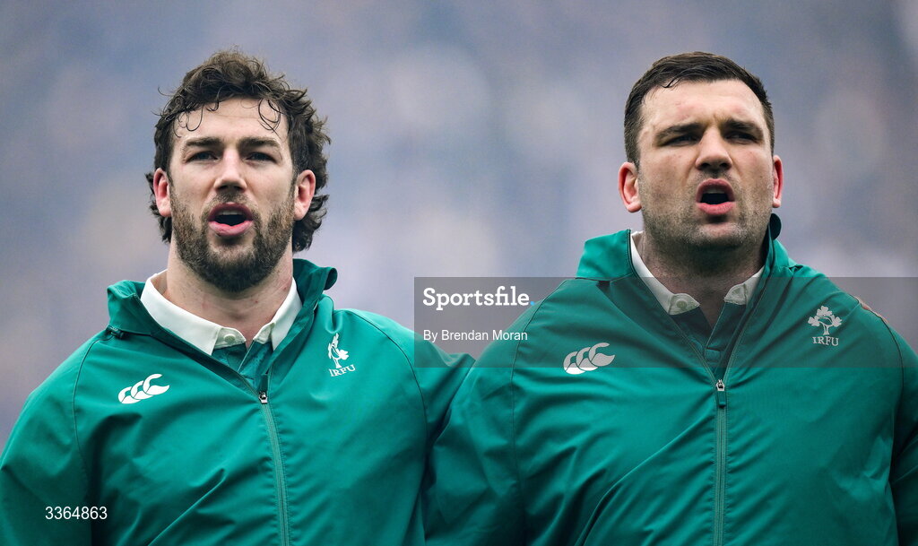 21 February 2026; Ireland captain Caelan Doris, left, and Tadhg Beirne during the national anthems before the Guinness 6 Nations Rugby Championship match between England and Ireland at the Allianz Stadium in Twickenham, England. Photo by Brendan Moran/Sportsfile