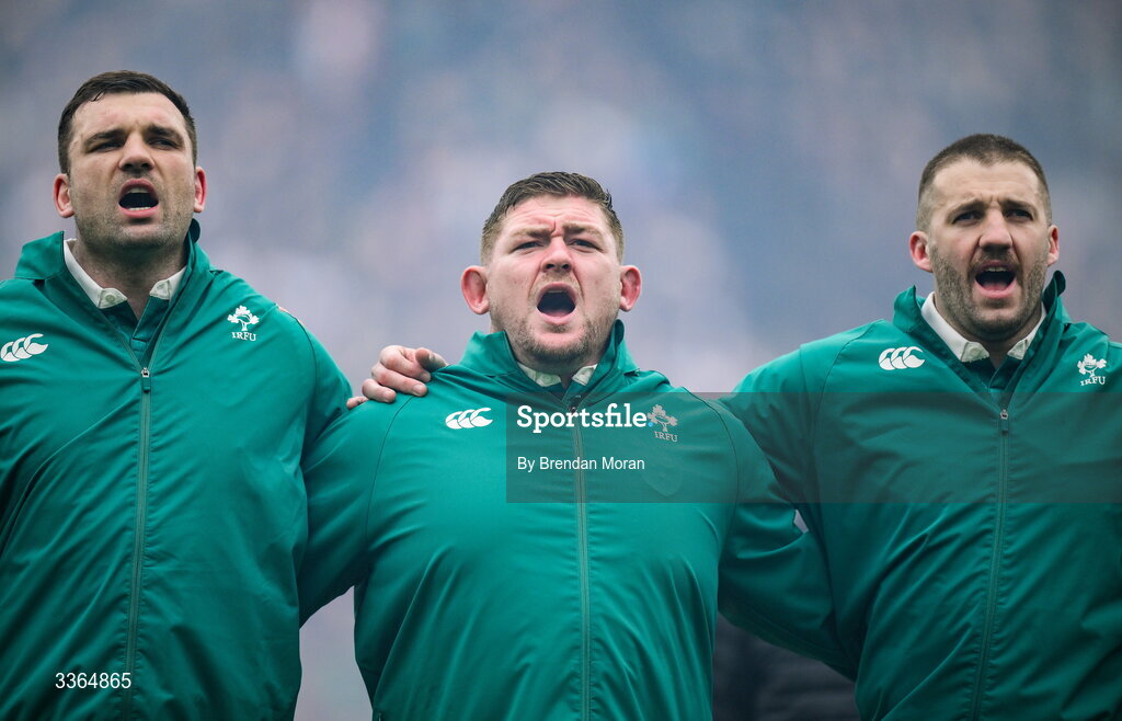 21 February 2026; Ireland players, from left, Tadhg Beirne, Tadhg Furlong and Stuart McCloskey during the national anthems before the Guinness 6 Nations Rugby Championship match between England and Ireland at the Allianz Stadium in Twickenham, England. Photo by Brendan Moran/Sportsfile