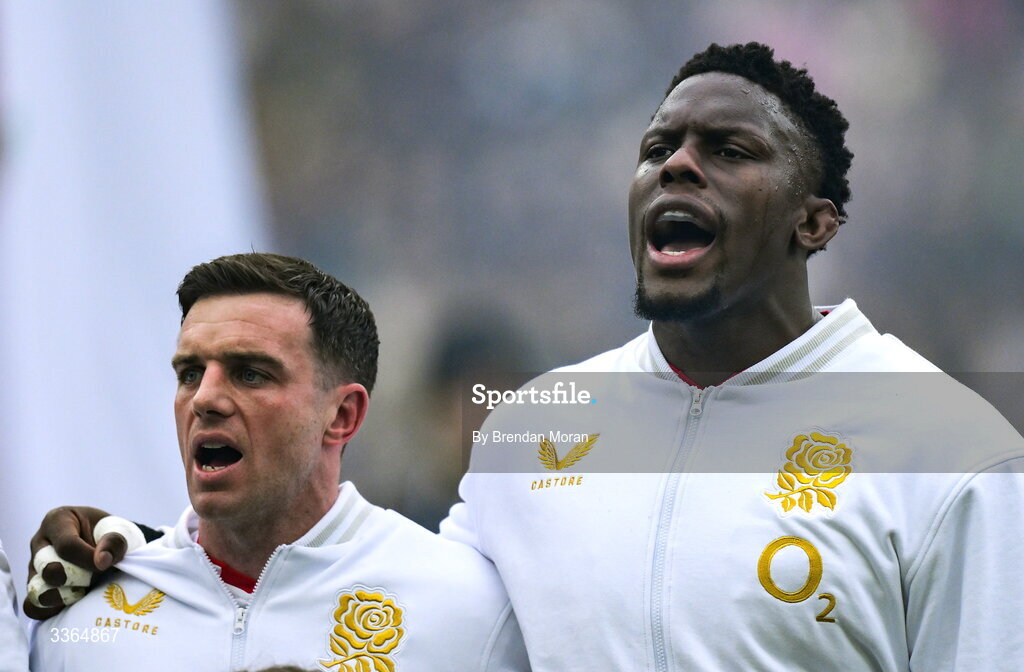 21 February 2026; England captain Maro Itoje, right, and George Ford during the national anthems before the Guinness 6 Nations Rugby Championship match between England and Ireland at the Allianz Stadium in Twickenham, England. Photo by Brendan Moran/Sportsfile