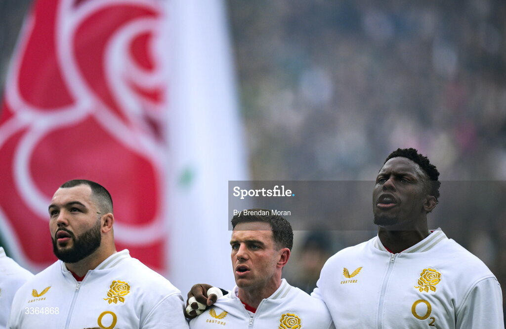 21 February 2026; England captain Maro Itoje, right, with teammates Ellis Genge and George Ford during the national anthems before the Guinness 6 Nations Rugby Championship match between England and Ireland at the Allianz Stadium in Twickenham, England. Photo by Brendan Moran/Sportsfile
