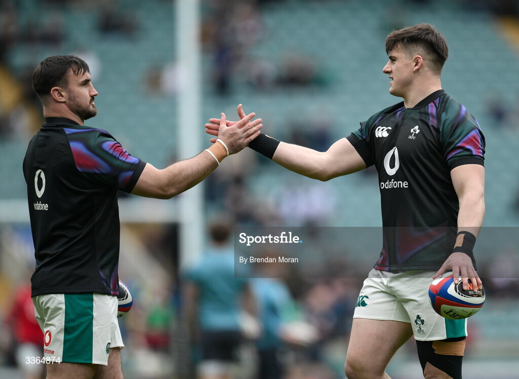 21 February 2026; Rónan Kelleher, left, and Dan Sheehan of Ireland before the Guinness 6 Nations Rugby Championship match between England and Ireland at the Allianz Stadium in Twickenham, England. Photo by Brendan Moran/Sportsfile