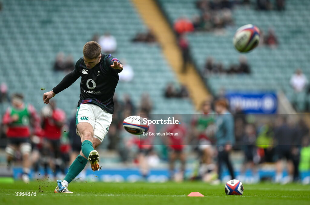 21 February 2026; Jack Crowley of Ireland warms up before the Guinness 6 Nations Rugby Championship match between England and Ireland at the Allianz Stadium in Twickenham, England. Photo by Brendan Moran/Sportsfile