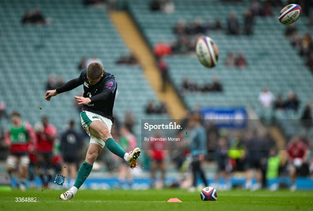 21 February 2026; Jack Crowley of Ireland warms up before the Guinness 6 Nations Rugby Championship match between England and Ireland at the Allianz Stadium in Twickenham, England. Photo by Brendan Moran/Sportsfile