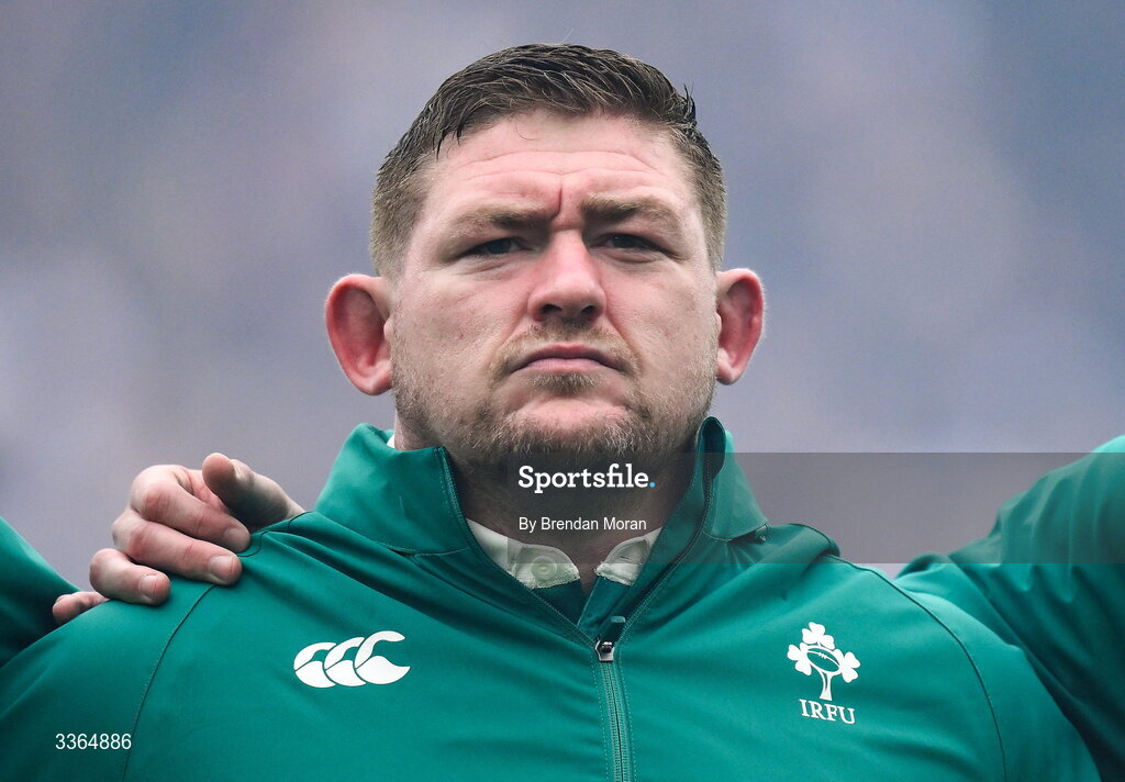 21 February 2026; Tadhg Furlong of Ireland during the national anthems before the Guinness 6 Nations Rugby Championship match between England and Ireland at the Allianz Stadium in Twickenham, England. Photo by Brendan Moran/Sportsfile
