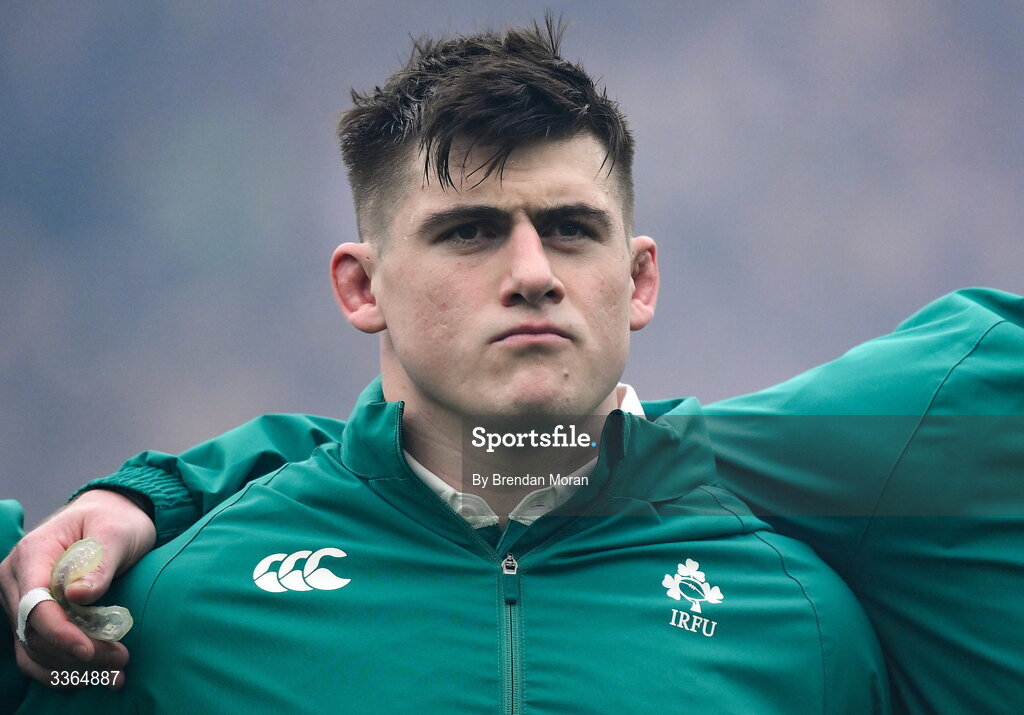 21 February 2026; Dan Sheehan of Ireland during the national anthems before the Guinness 6 Nations Rugby Championship match between England and Ireland at the Allianz Stadium in Twickenham, England. Photo by Brendan Moran/Sportsfile