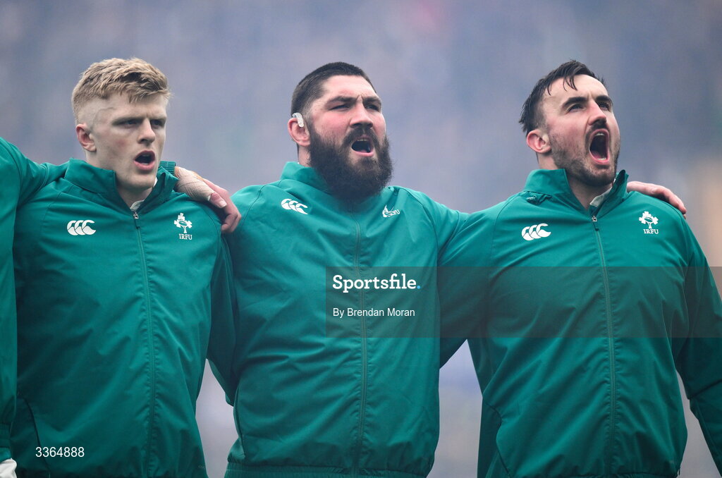 21 February 2026; Ireland players, from left, Tommy O'Brien, Tom O’Toole and Rónan Kelleher during the national anthems before the Guinness 6 Nations Rugby Championship match between England and Ireland at the Allianz Stadium in Twickenham, England. Photo by Brendan Moran/Sportsfile