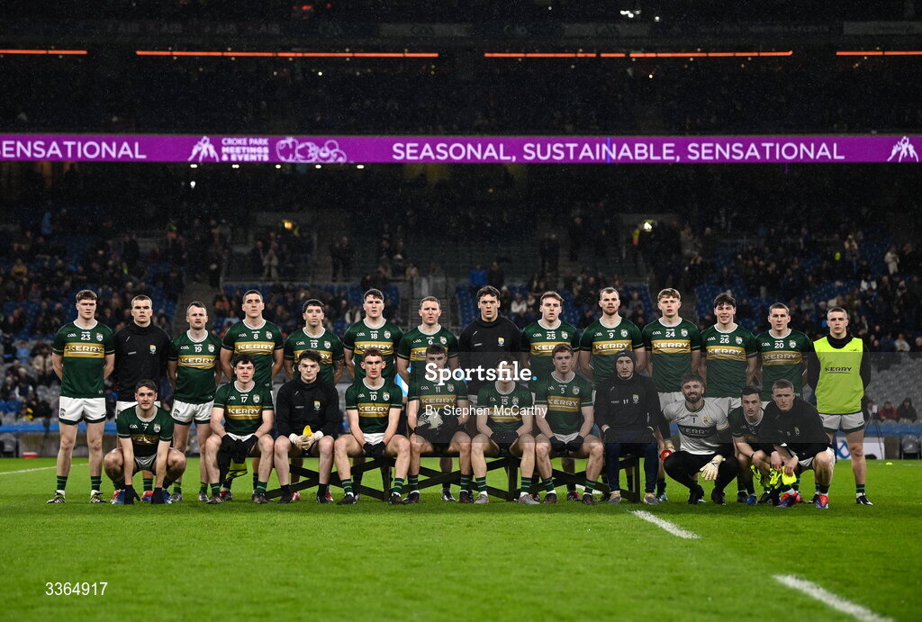 21 February 2026; The Kerry squad, back row, from left, Ciarán Collins, Dylan Casey, Tom O'Sullivan, Joe O'Connor, Tony Brosnan, Liam Smith, Tadhg Morley, David Clifford, Charlie Keating, Mark O'Shea, Darragh Lyne, Cathal Brosnan, Donagh O'Sullivan and Evan Looney, with, front row, Graham O'Sullivan, Shane Murphy, Seán Broderick, Cillian Trant, Seán O'Shea, Keith Evans, Armin Heinrich, Paudie Clifford, Shane Murphy, Paul Murphy and Jason Foley before the Allianz Football League Division 1 match between Dublin and Kerry at Croke Park in Dublin. Photo by Stephen McCarthy/Sportsfile