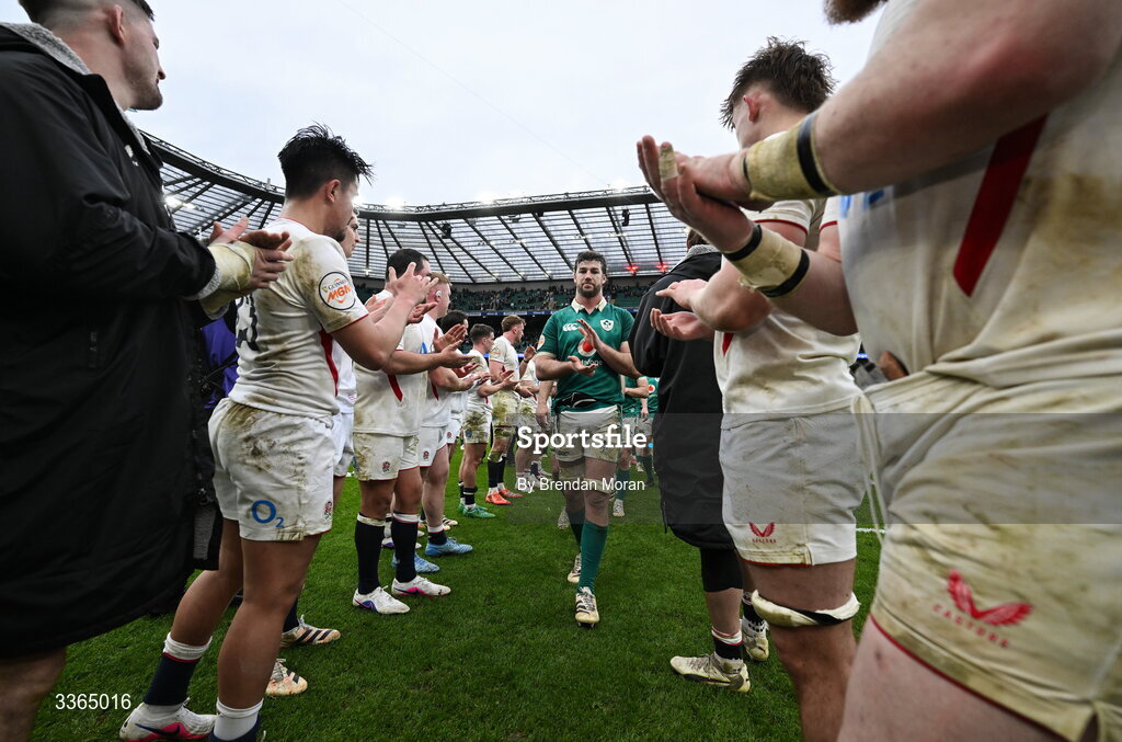 21 February 2026; Ireland captain Caelan Doris leads his team from the pitch as they are applauded by the England team after the Guinness 6 Nations Rugby Championship match between England and Ireland at the Allianz Stadium in Twickenham, England. Photo by Brendan Moran/Sportsfile