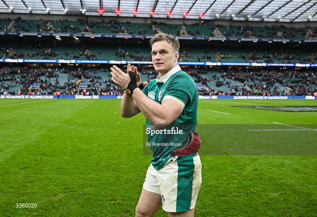 21 February 2026; Josh van der Flier of Ireland applauds supporters after the Guinness 6 Nations Rugby Championship match between England and Ireland at the Allianz Stadium in Twickenham, England. Photo by Brendan Moran/Sportsfile